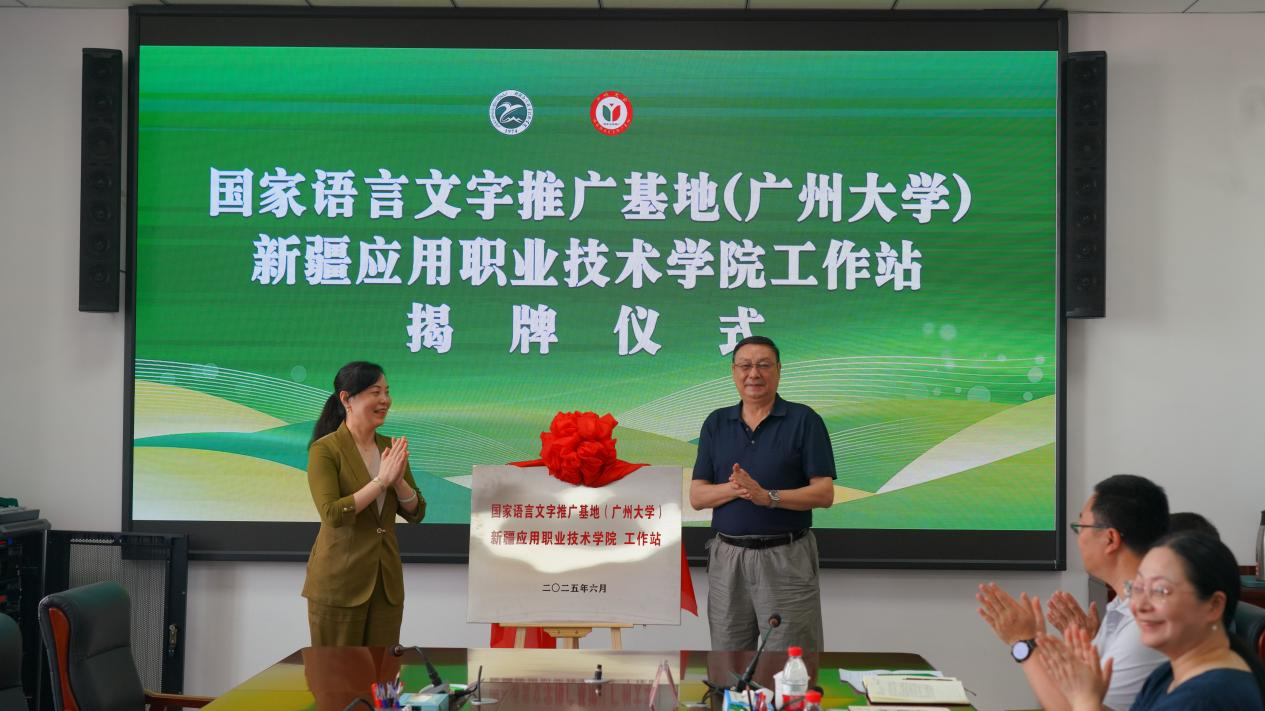 在全体与会人员的见证下,新疆应用职业技术学院党委副书记、院长叶列吾别克·那克斯别克与国家语言文字推广基地(广州大学)代表共同为“国家语言文字推广基地(广州大学)新疆应用职业技术学院工作站”揭牌。