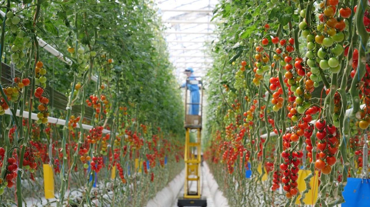 霍尔果斯农业科技发展集团有限公司生产主管姜岳丛说:“得益于双层高分子功能膜覆盖、多层次管道加热、智能精准控制、二氧化碳回收利用等六大核心技术系统,我们实现对温度、光照、湿度和二氧化碳浓度的精确控制,确保番茄规模化、自动化生产,采摘期长达9个月,产量是普通番茄的7倍以上。”