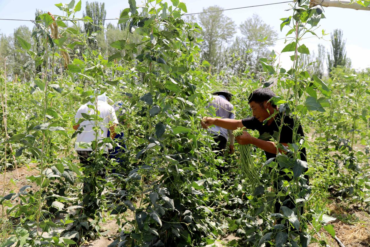 温宿县阿热勒镇喀什博依村农民采收豇豆(张浩 摄)