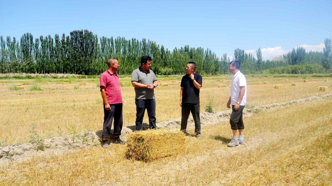 在温宿县阿热勒镇皮亚其村,阿热勒乡党委副书记、镇长阿布都吾甫尔·库尔班了解小麦收割情况(赵新昌 摄)