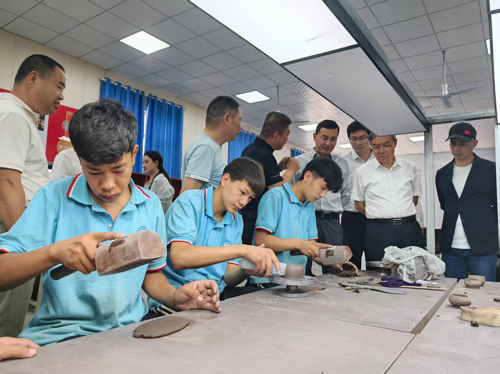 这一路,直扑现场,从伽师七彩山紫砂区现场到紫砂炼泥烧制厂房、大师工作室到学生技能培训班,从紫砂产学研试点基地到技工学校紫砂专项培训点,围绕矿产选择、开发利用、泥料制作、产品生产、艺人技能培训、长远发展等主题,调研组一行深入一线,边走边看,边听边问,察实情、出实招,破难题、促发展。