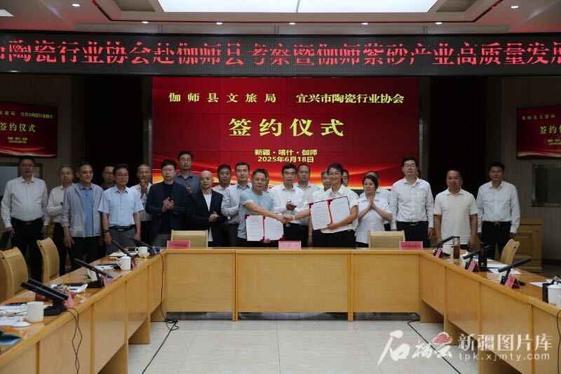 6月18日,宜兴市陶瓷行业协会赴伽师县考察暨伽师紫砂产业高质量发展座谈会在伽师县举行。会上,宜兴市陶瓷行业协会和伽师县文旅局共同签署了陶瓷发展合作意向。