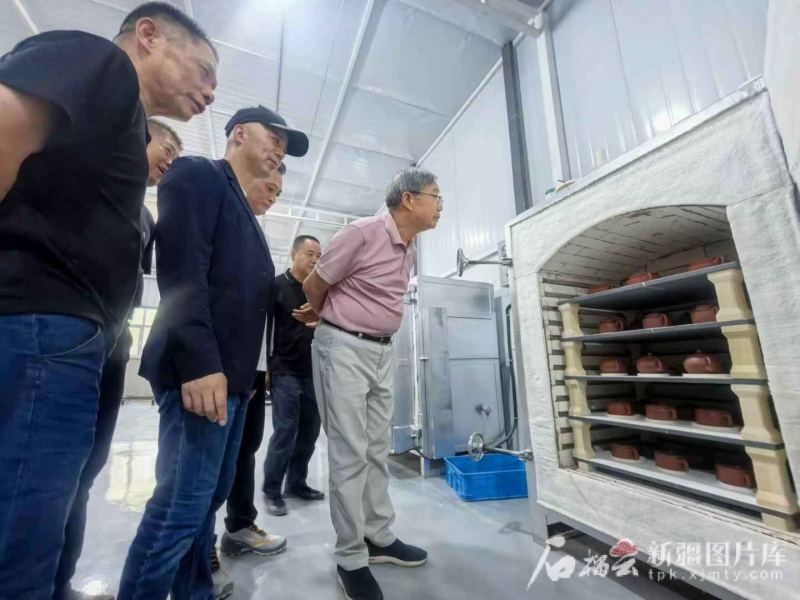 宜兴市陶瓷行业协会的专家们在伽师紫砂陶瓷有限公司查看刚烧制好的紫砂壶。石榴云/新疆日报记者 何新社摄