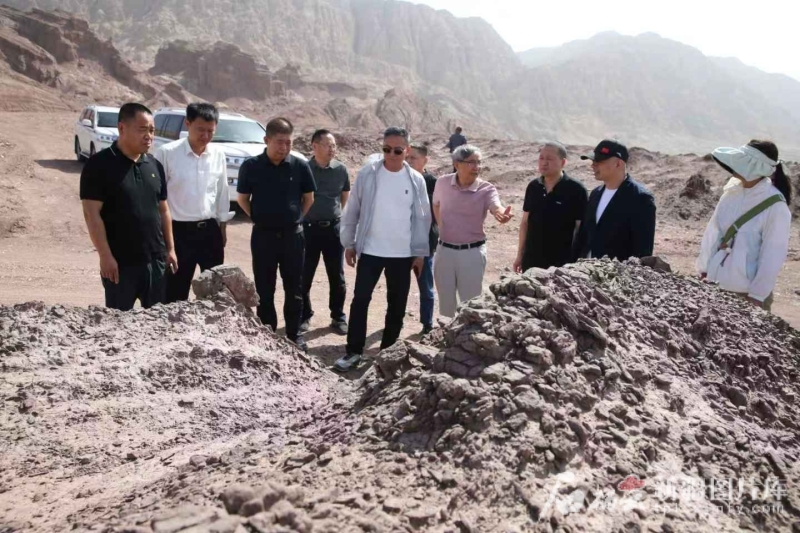 宜兴市陶瓷行业协会的专家们在伽师县七彩山考察紫砂矿产。石榴云/新疆日报记者 何新社摄