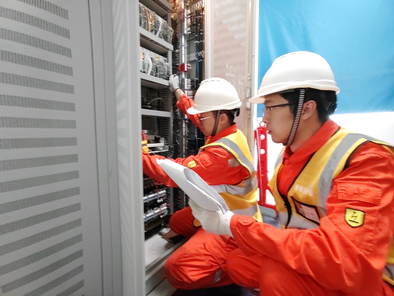 图为西部管道公司生产技术服务中心员工在设备检修现场正在进行保护装置接口故障排查。(摄影:聂保刚)