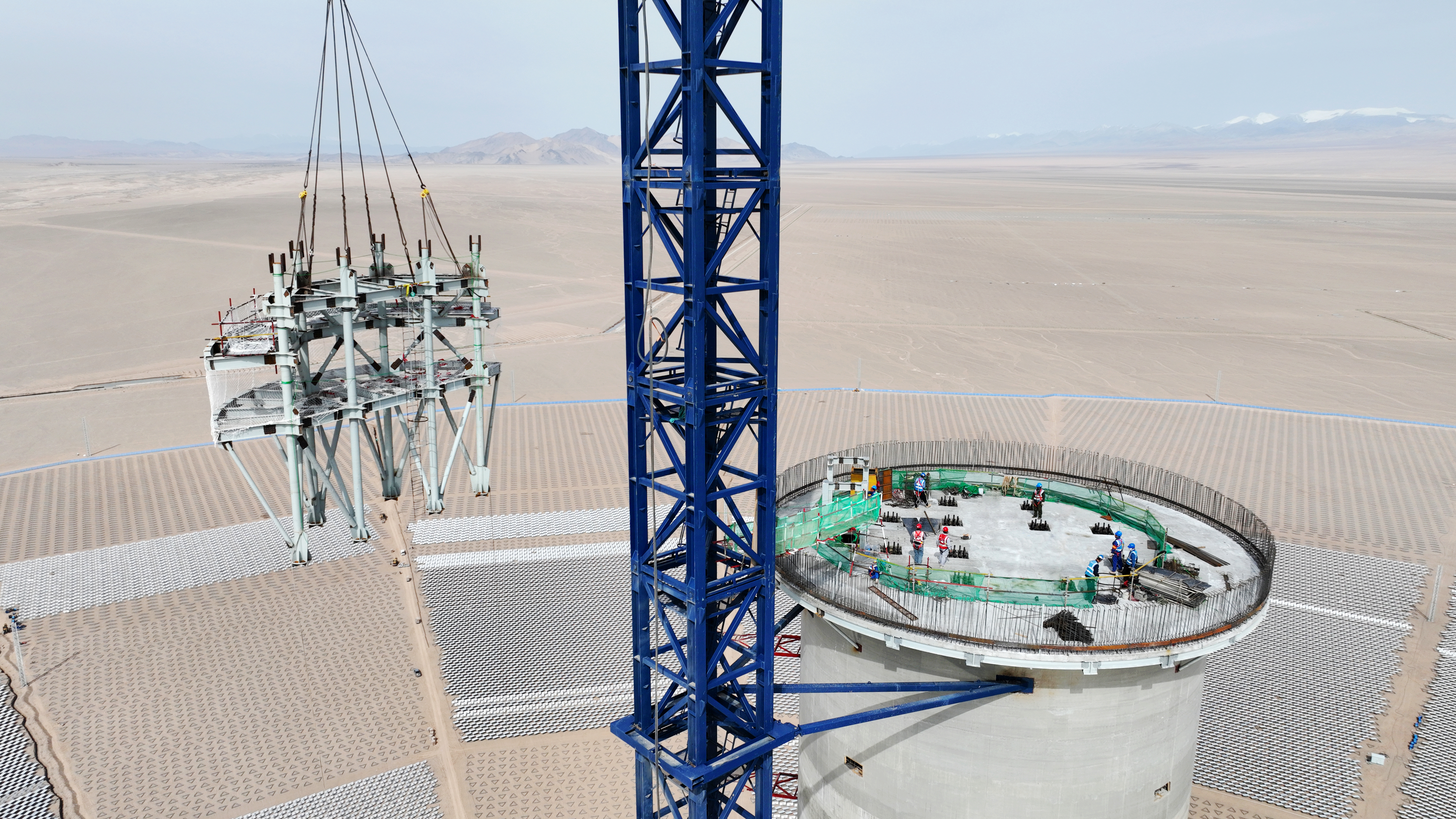 “吸热塔塔顶钢结构共分为四段,全部采用60吨塔吊进行吊装作业。其中,第一段净高10.95米,单榀重量约35.7吨,每段均分为两榀。为保障吊装工作安全顺利实施,项目部科学规划、精心部署,充分借鉴山东电建三公司摩洛哥努奥、南非红石、青海海西等国内外同类项目的丰富经验,并结合本项目实际情况,对施工方案进行优化完善,圆满完成了第一段钢结构顺利就位。”中电建新能源集团若羌电建睿达新能源有限公司项目部负责人黄栋说。