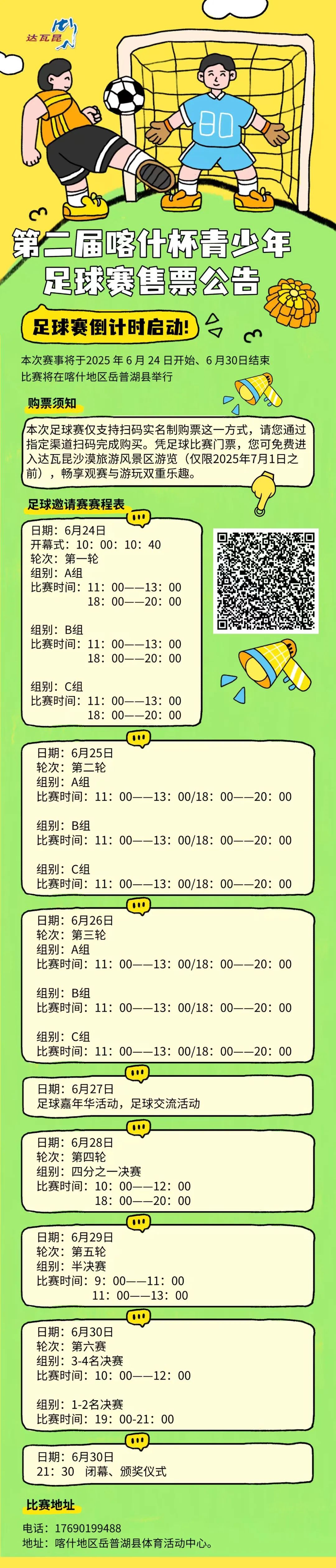 本届赛事期间,新旅岳普湖公司配合喀什地区相关单位共同创新推出“赛事+文旅”模式,串联喀什古城、帕米尔高原等标志性景区,打造“十美喀什”主题旅游线路。参赛队伍与观众可凭赛事门票免费游览岳普湖县达瓦昆沙漠旅游风景区,在绿茵竞技之余,感受千年古城的沧桑韵味与叶尔羌河的壮阔风姿。(刘杨杨)