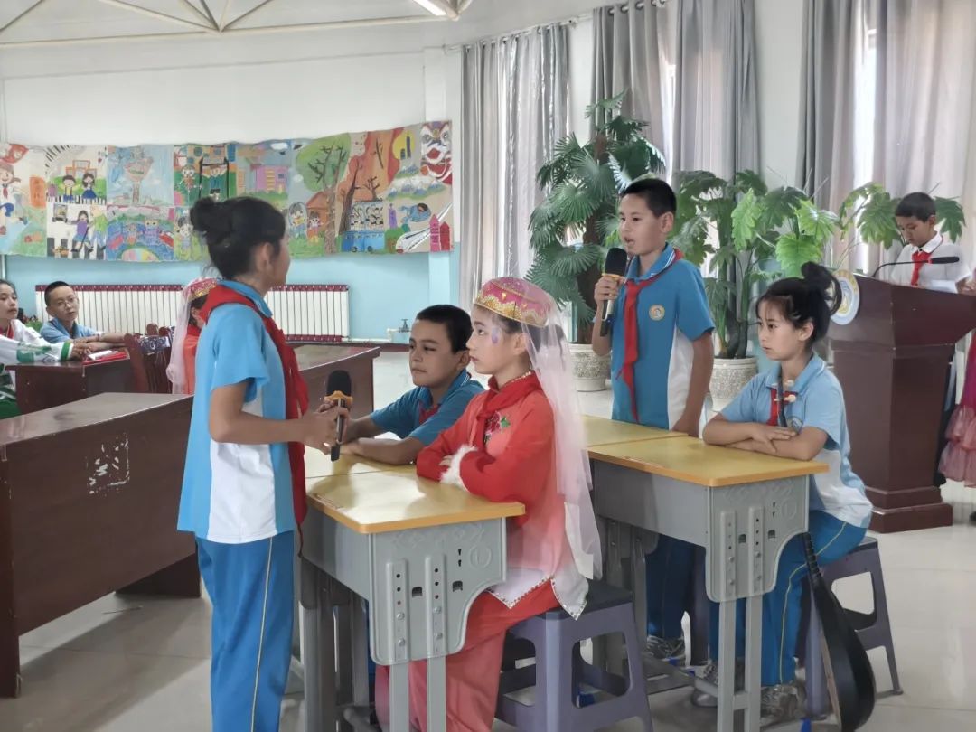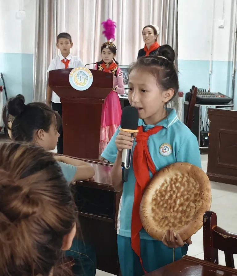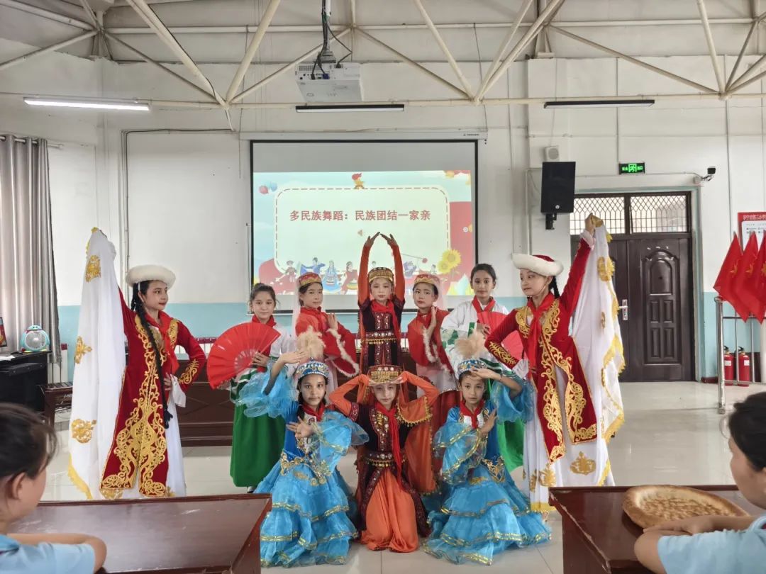 在活动中,伊宁市第三小学四(2)中队第一小队的队员们化身“文化使者”,用生动的语言与丰富的影像,带领南京师生云游伊犁河、喀赞其民俗街、六星街等特色景区,从碧波荡漾的河畔风光到充满异域风情的街巷建筑,大家领略到伊犁独特的地域之美。第二小队聚焦伊犁美食文化,从香脆可口的馕、香气四溢的手抓饭到酸甜解暑的酸奶疙瘩,图文并茂地介绍美食背后的饮食文化与民族习俗。第三小队带来原创民族团结情景剧,通过模拟生活中不同民族同学互帮互助的场景,生动诠释“民族团结一家亲”的深刻内涵。第四小队队员身着绚丽多彩的维吾尔族、哈萨克族、回族、塔吉克族等民族服饰,为大家带来欢快的民族舞蹈,灵动的舞姿与精美的服饰,赢得南京师生纷纷点赞。