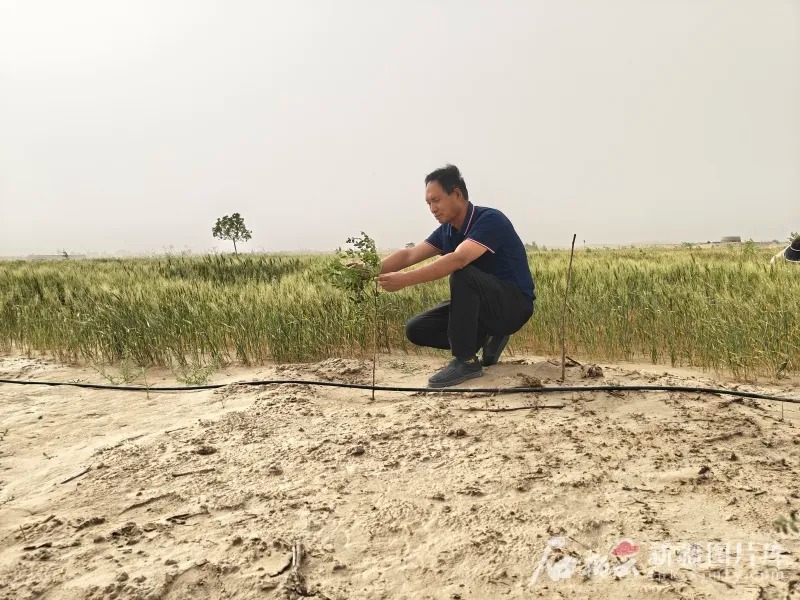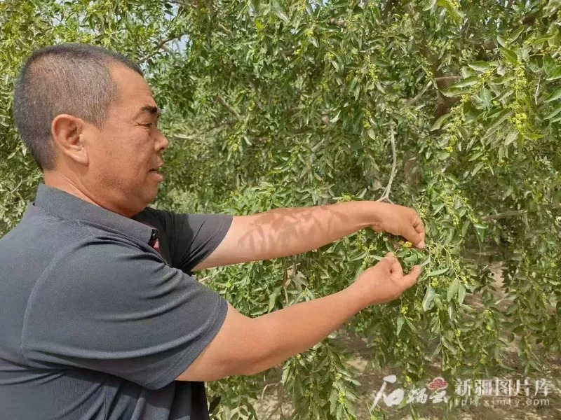 6月12日,村民赵连斌查看枣树生长情况。石榴云/新疆日报记者 张磊摄