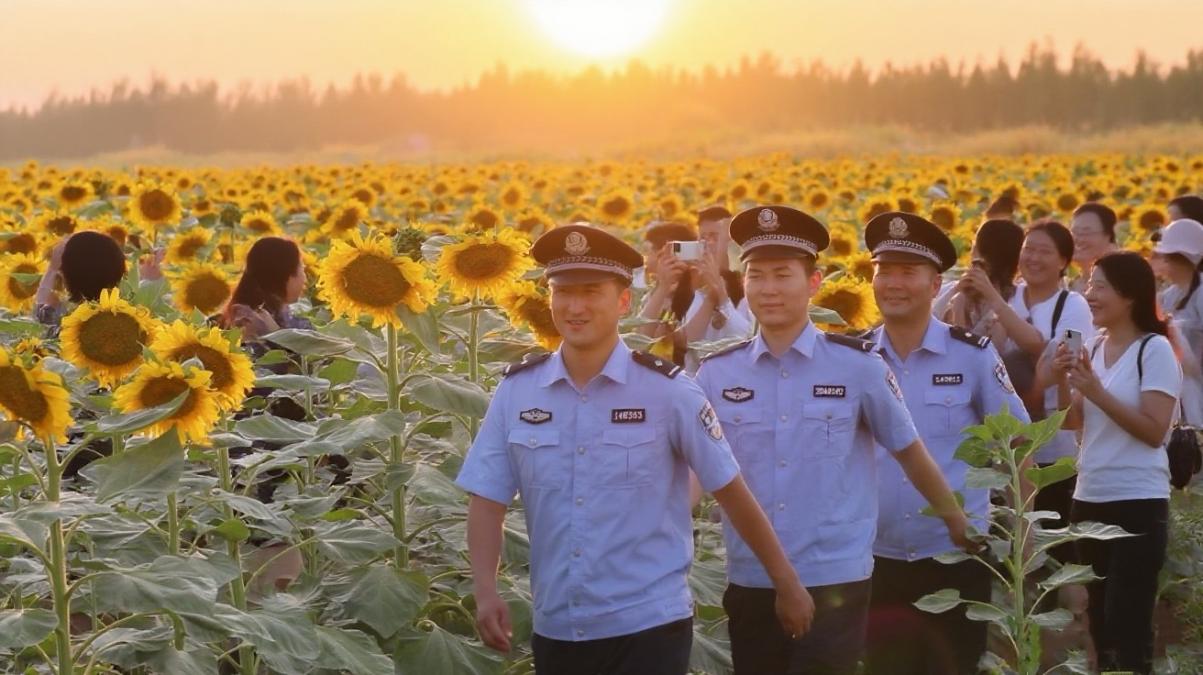 夏季的田野里,朵朵葵花随风摇曳,微风吹过荡起层层金色波浪,犹如一幅动起来的油画为美丽乡村建设增添了别样的色彩,近日,温宿县阿热勒镇4000亩金黄的向日葵浪漫“上线”,一片片黄灿灿的葵花热烈明亮,它们张开“笑脸”、轻曳身姿,吸引不少游客驻足欣赏、打卡拍照,在这金色海洋中,一抹抹“警察蓝”穿梭其中,用坚守和奉献,为游客的安全保驾护航。