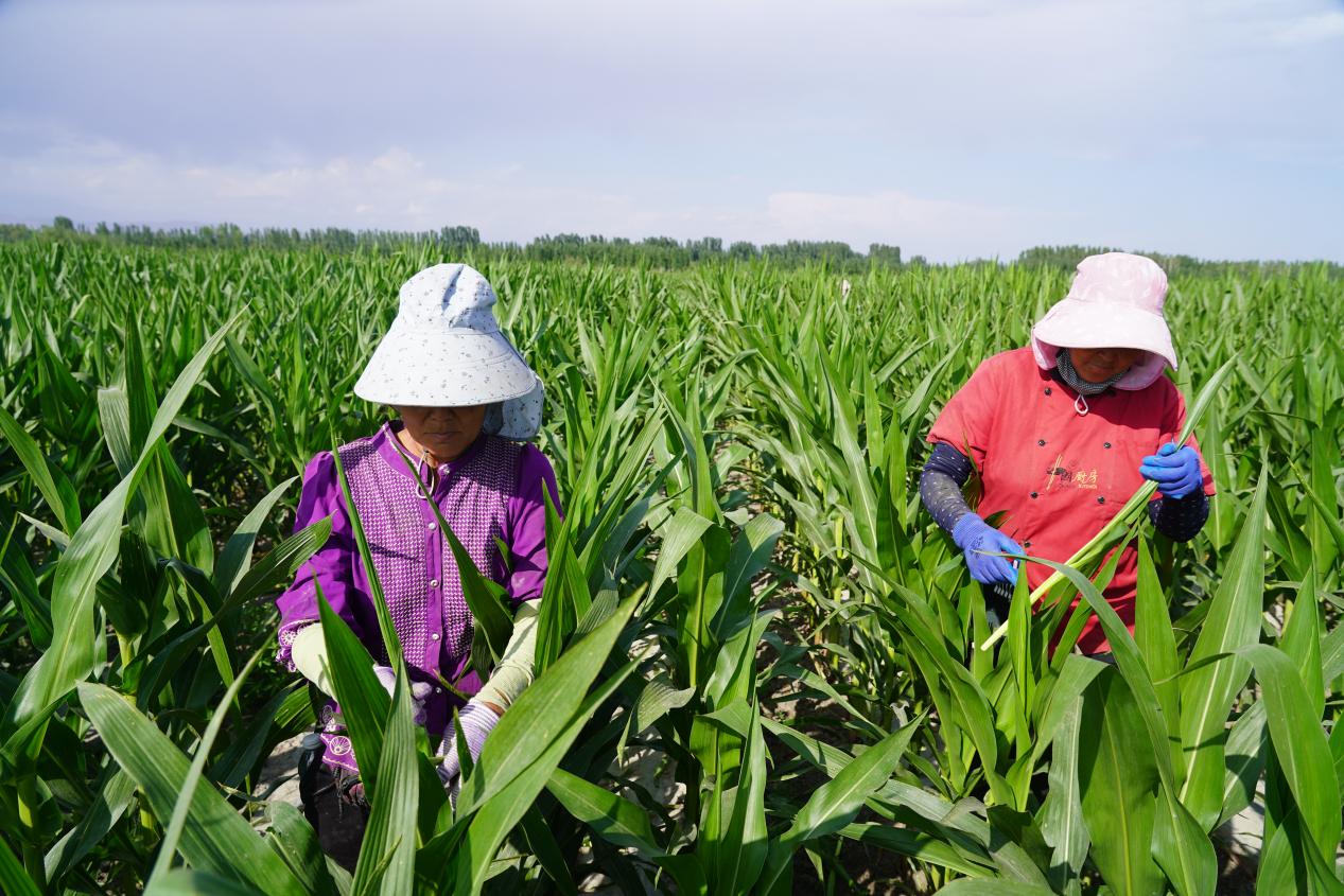 (图为:在托乎拉乡尤喀克库尔巴格村,种植户正在对杂交玉米进行人工授粉 艾海提·毛勒吐尔迪 摄)