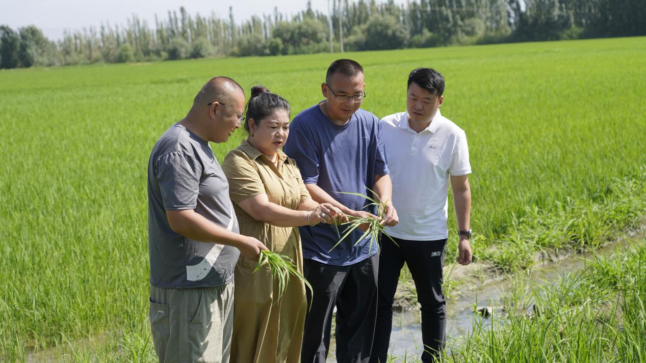 自治区农业科学院作物研究所的专家在查看水稻生长情况。(阿依努尔 摄)