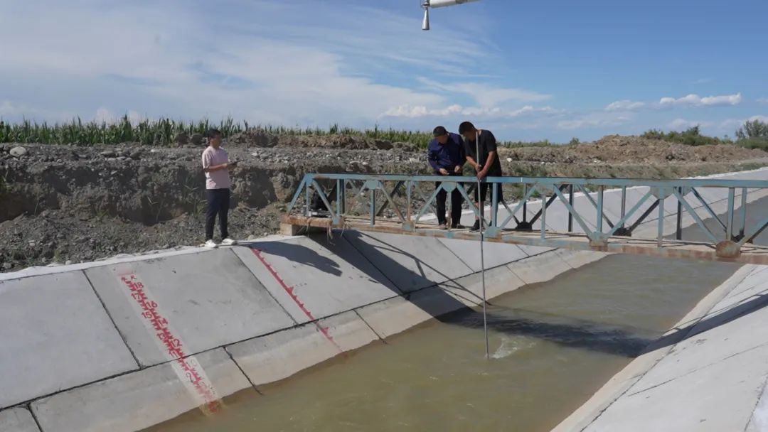 与此同时,在沙湾市沙湾河海子湾水库泄水渠测水断面处,沙湾河管理站的工作人员正利用仪器对渠水水流速度、流量进行监测,实时掌握水流数据。