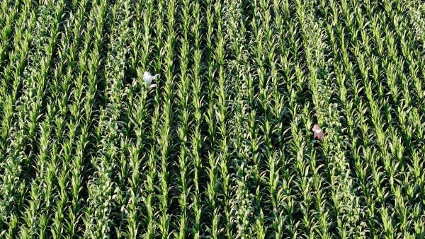 从高空俯瞰,工人们在沙湾市东湾镇东湾村的制种玉米地里进行抽雄作业 常乙 摄