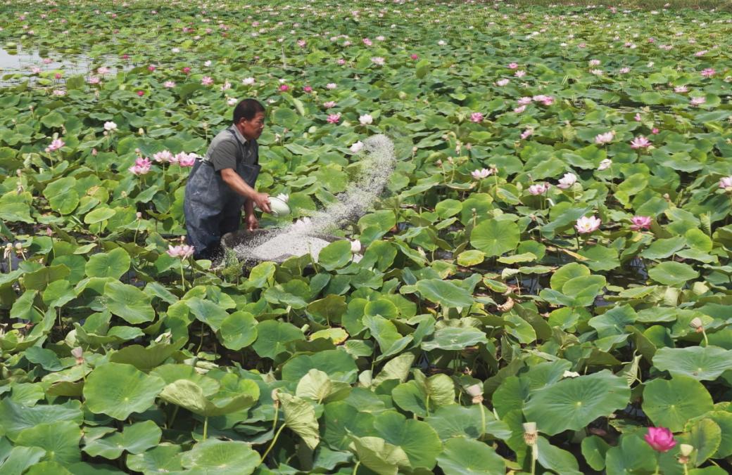 7月3日,在阿拉尔市新开岭镇,种植户翟林友一大早就开始忙碌,精心地为荷花施肥。