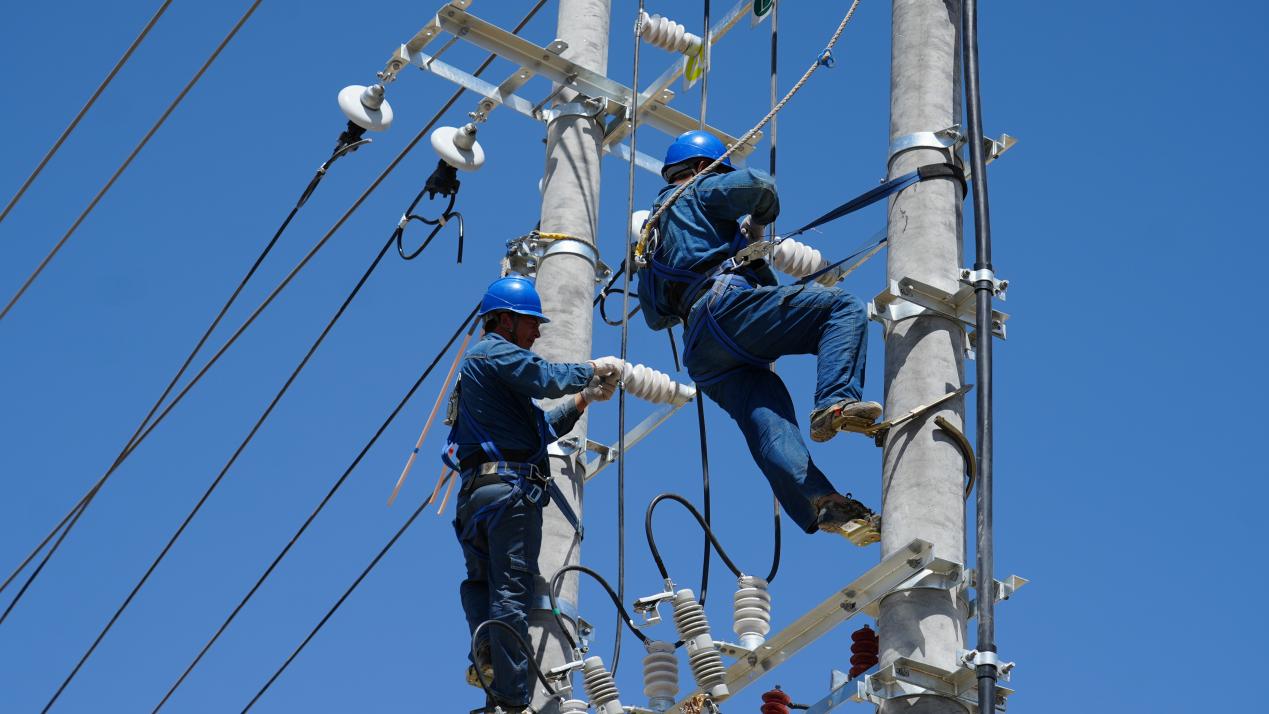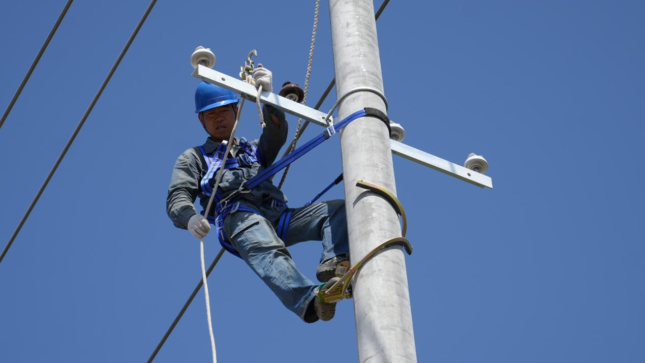 电力工人在柯柯牙镇戈壁新村开展新线路架设(李亚楠 摄)