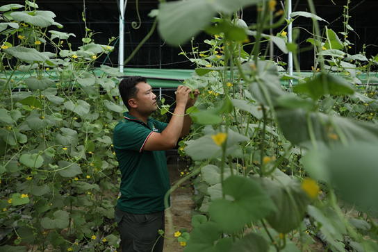 技术员阿比力提甫·艾力正在为甜瓜进行人工授粉。潘许摄
