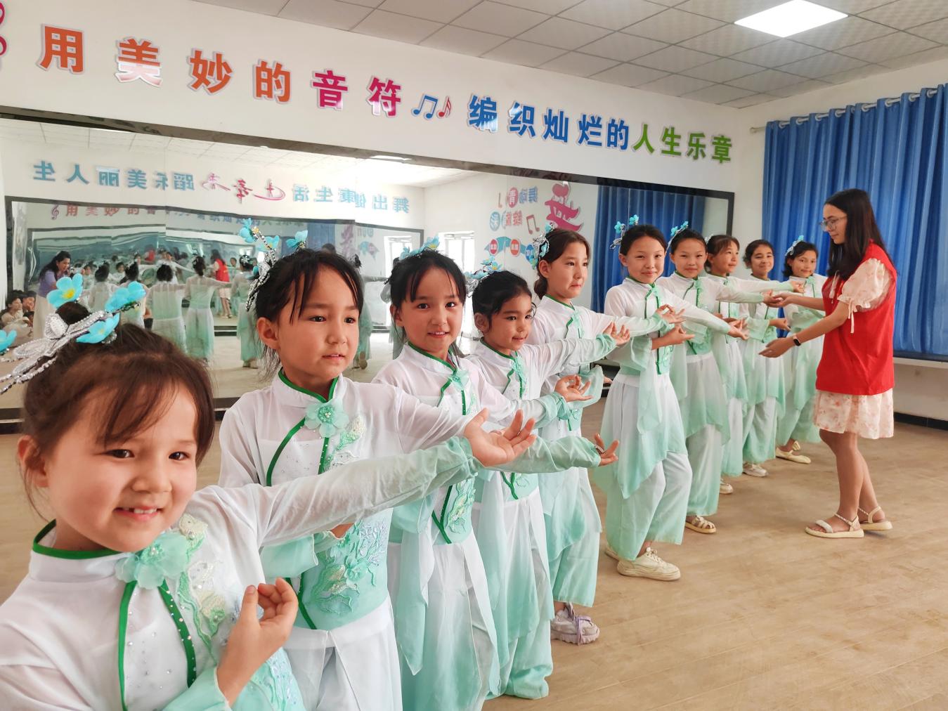 在温宿县克孜勒镇“红领巾”小课堂上,孩子们在老师的指导下练习舞蹈。玛依拉·阿卜来提 摄