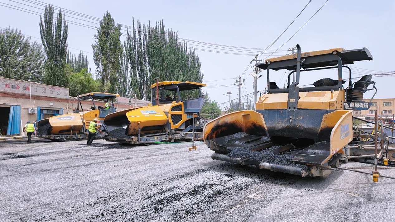 7月9日,墨玉县X633县道(吐外特乡-老兵路)道路提升改造项目进入沥青铺设收尾阶段。施工现场,两台沥青摊铺机正匀速推进,滚烫的沥青混合料被均匀摊铺在路面上,紧随其后的压路机来回碾压,将路面压得平整坚实。施工人员分工协作,有的测量摊铺厚度,有的处理路面边角,现场一派忙碌而有序的景象。