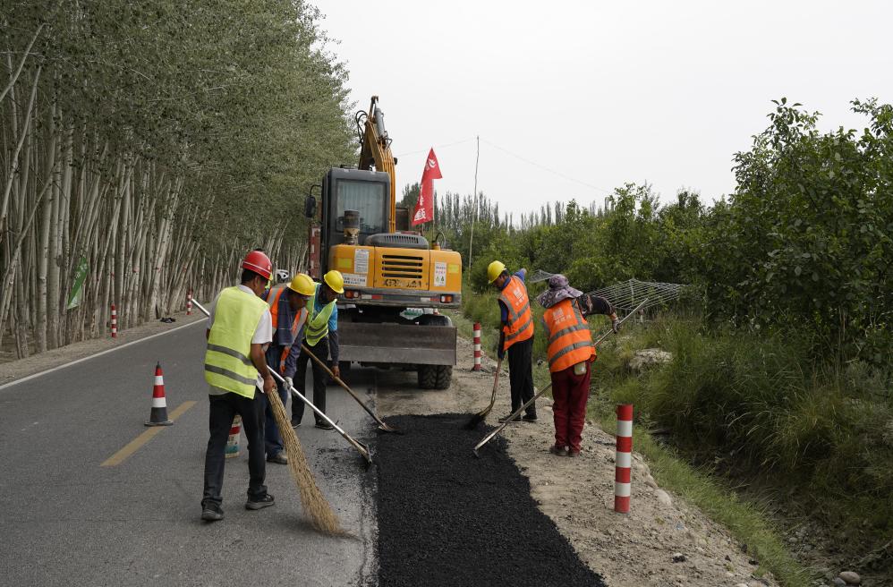 在温宿县阿热勒镇,工人们正在对破损的油路进行修补。阿依努尔 摄