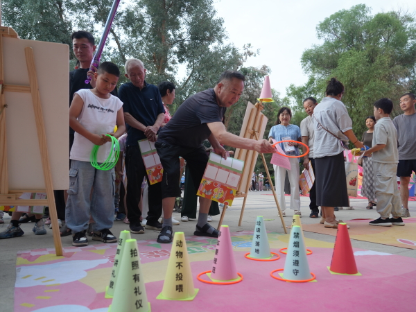 文明主题游戏体验区,文明实践志愿者结合沙包投掷、猜谜、保龄球投掷等游戏项目进行“微宣讲”,让群众在玩中学、学得懂、用得上。“边玩边了解党的创新理论、学懂文明知识,感触很深。”返乡大学生凯赛尔·克来木分享了他的体验。