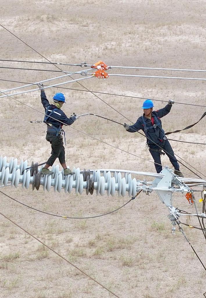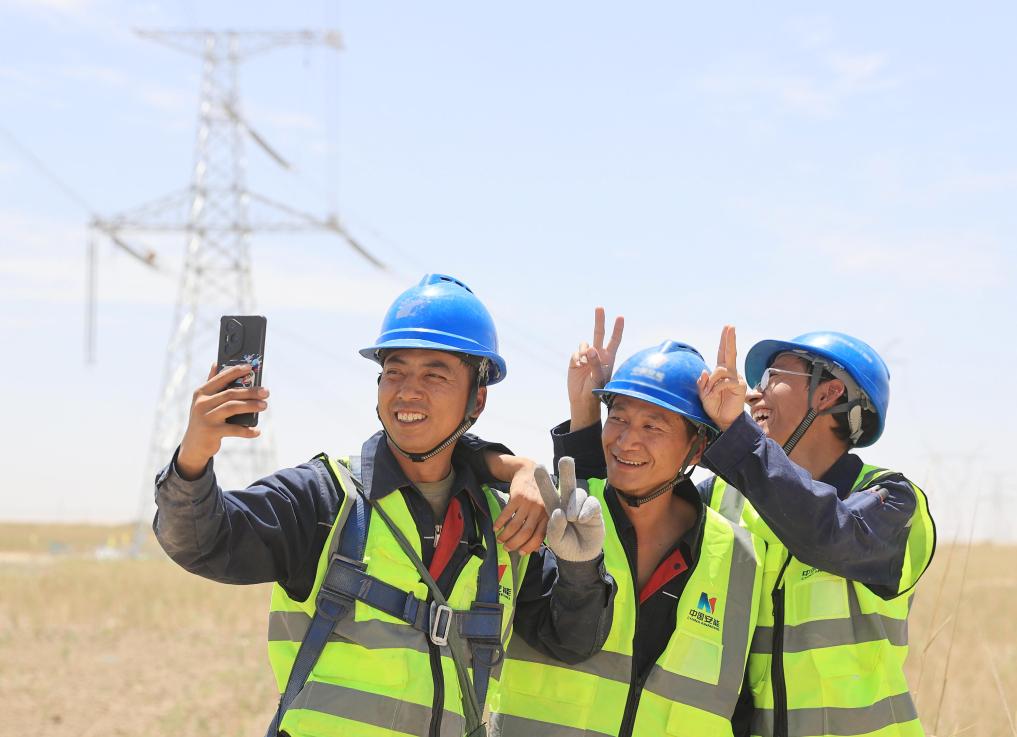 13日正午,对讲机里传来一声“通了!全线贯通了!”——环塔里木盆地750千伏输变电工程正式“合龙”!陈林爬下铁塔和工友并肩合影,笑容洋溢在他们被阳光晒得黝黑的面庞上。
