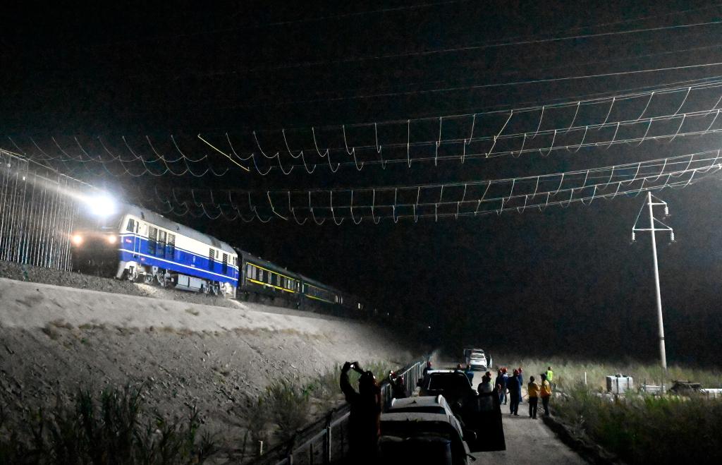 7月10日凌晨,环塔里木盆地750千伏输变电工程跨越和若铁路,一列客车从跨越网下安全驶过。