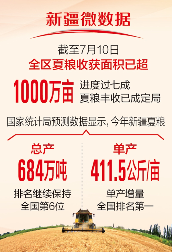 记者从自治区农业农村厅获悉:新疆各地不误农时推进夏粮收获各项工作,截至7月10日,全区夏粮收获面积已超1000万亩,进度过七成,夏粮丰收已成定局。