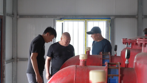 7月16日,沙湾市农业农村局干部、四道河子镇干部与三岔坪村干部查看滴灌设施。马金明 摄