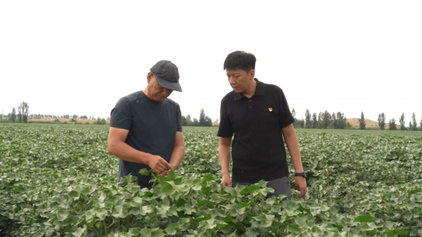 7月16日,沙湾市农业农村局干部与四道河子镇干部查看棉花长势情况。马金明 摄