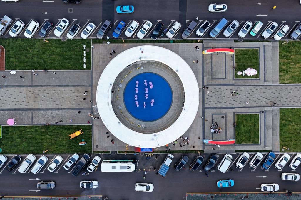 7月11日,在昭苏县天马旅游街区,当地文艺工作者为游客表演歌舞节目(无人机照片)。新华社发(杨天民摄)