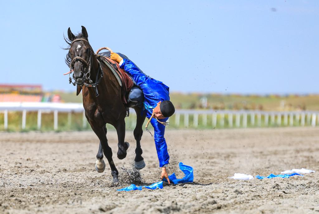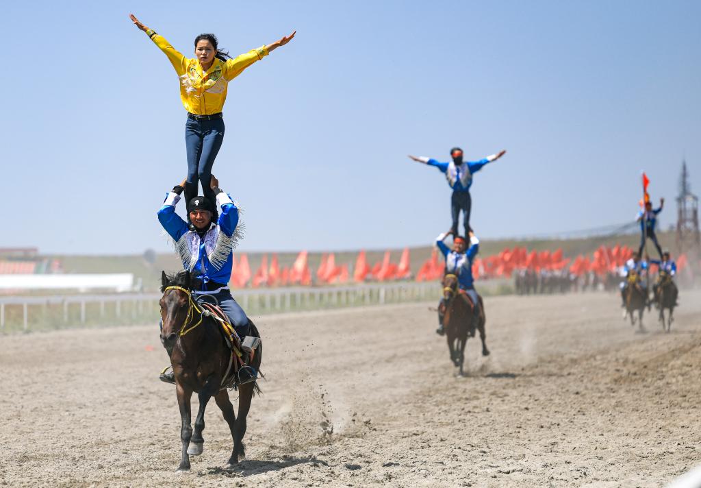 7月19日在新疆昭苏拍摄的2025新疆伊犁天马文化旅游节开幕式“马上拾银”表演。新华社记者 王菲 摄
