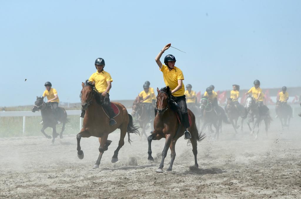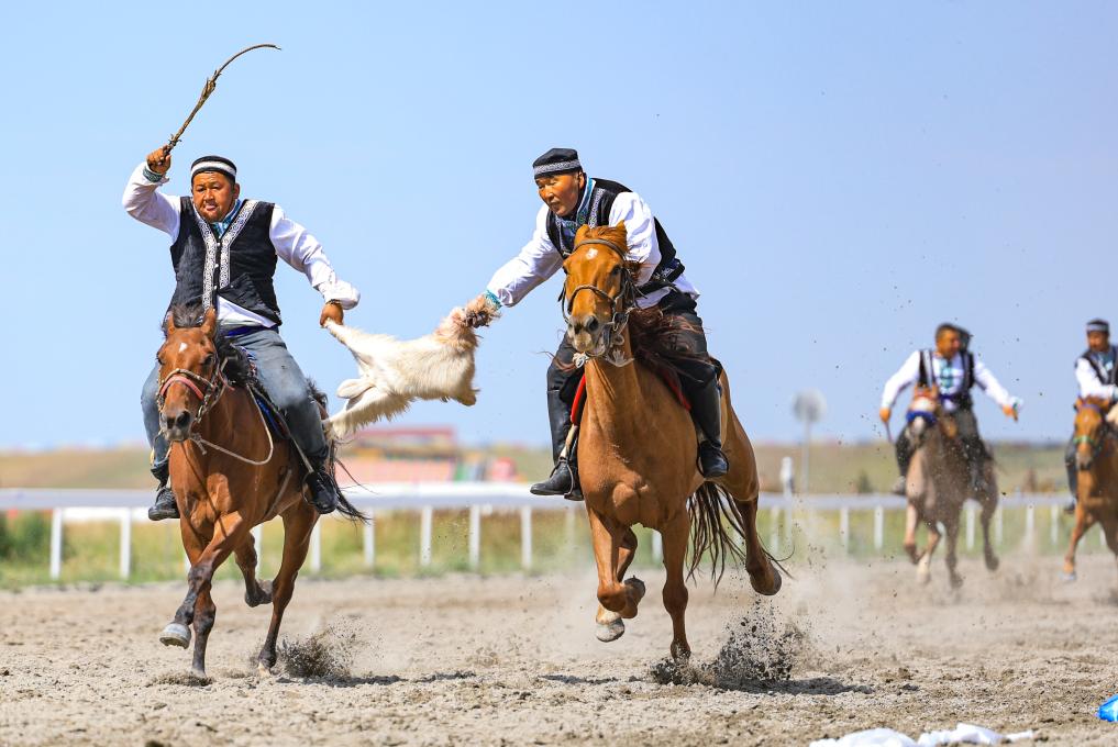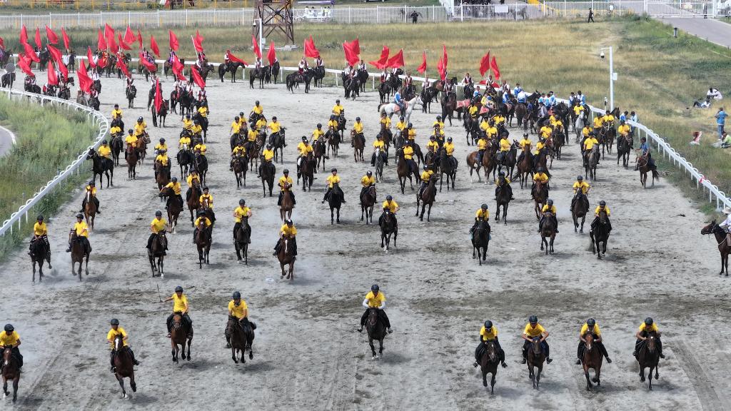 7月19日在新疆昭苏拍摄的2025新疆伊犁天马文化旅游节开幕式“叼羊”表演。新华社记者 王菲 摄
