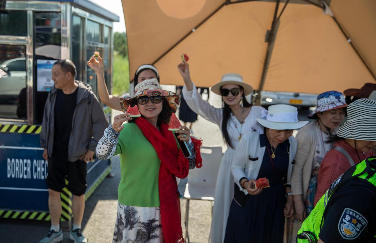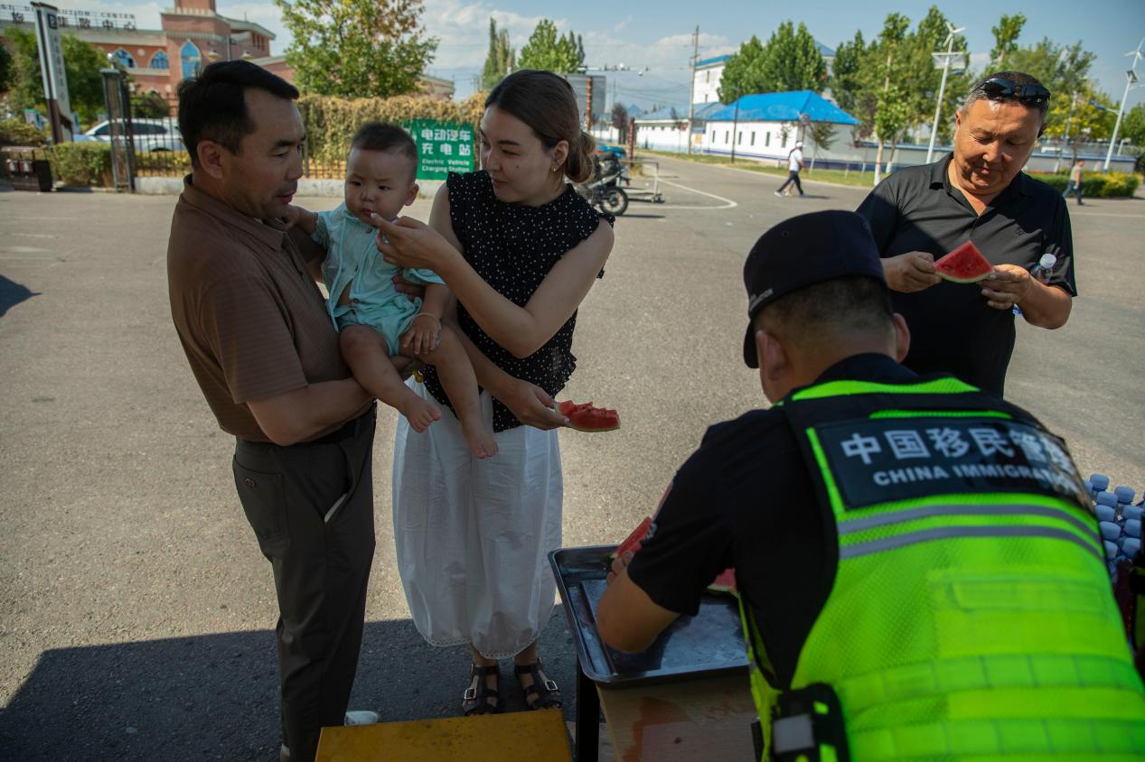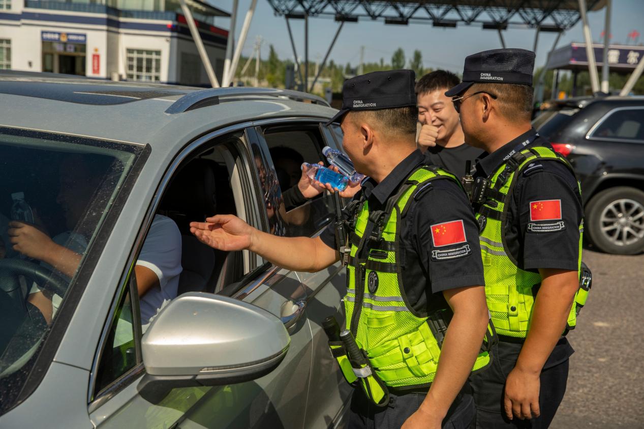 7月19日,新疆伊犁州气温飙升至42℃,伊犁边境管理支队八十间房子边境检查站在执勤现场设立了临时服务点开展高温送清凉活动。服务点为过往群众准备了矿泉水、藿香正气水、西瓜等防暑物资,服务点民警在炎炎烈日下热情地将这些防暑物资递到过往群众手中,同时不忘提醒大家在高温天气下做好防暑措施,避免长时间在户外活动。