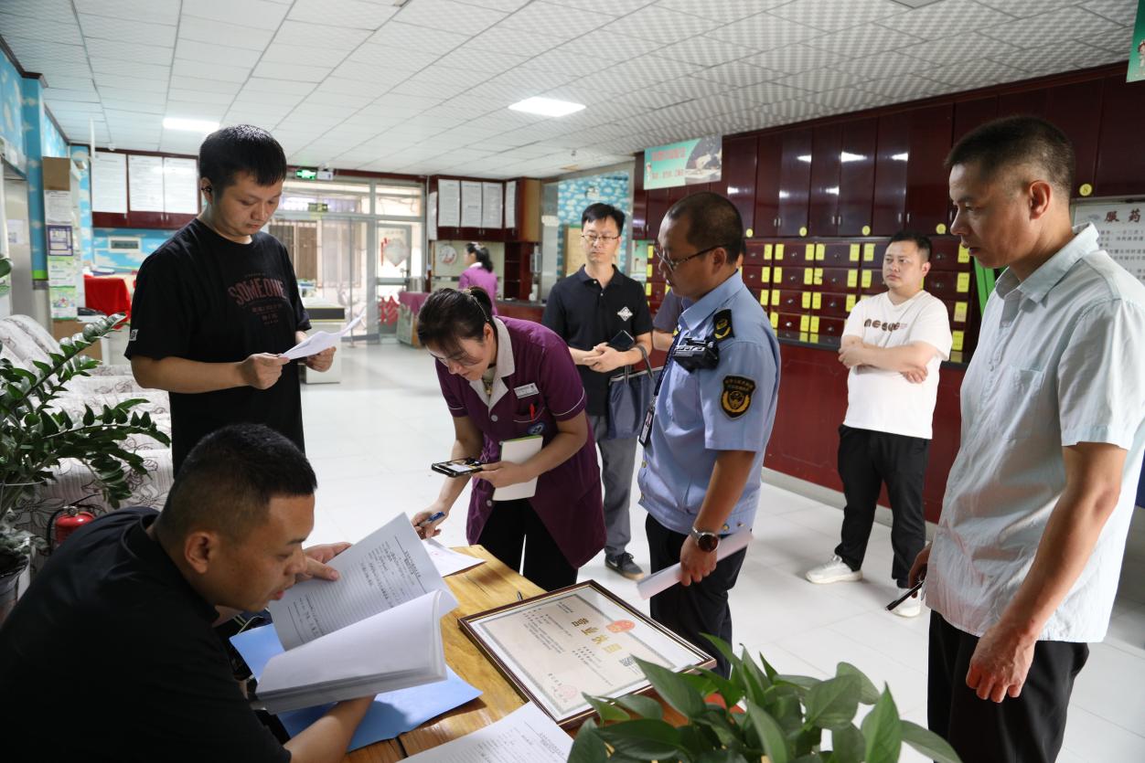 联合执法组工作人员正在检查阿拉尔市新苑小区某中医诊所防护窗(网)安装情况。董祝 摄
