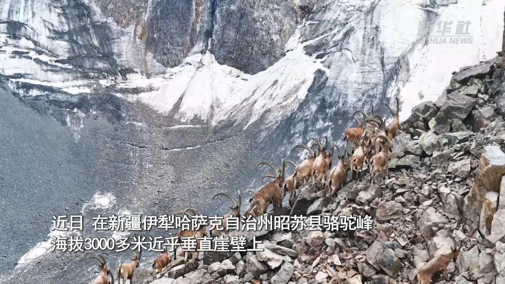 近日,在新疆伊犁哈萨克自治州昭苏县骆驼峰,海拔3000多米近乎垂直崖壁上,一群国家二级保护动物北山羊如灵动舞者穿梭觅食。
