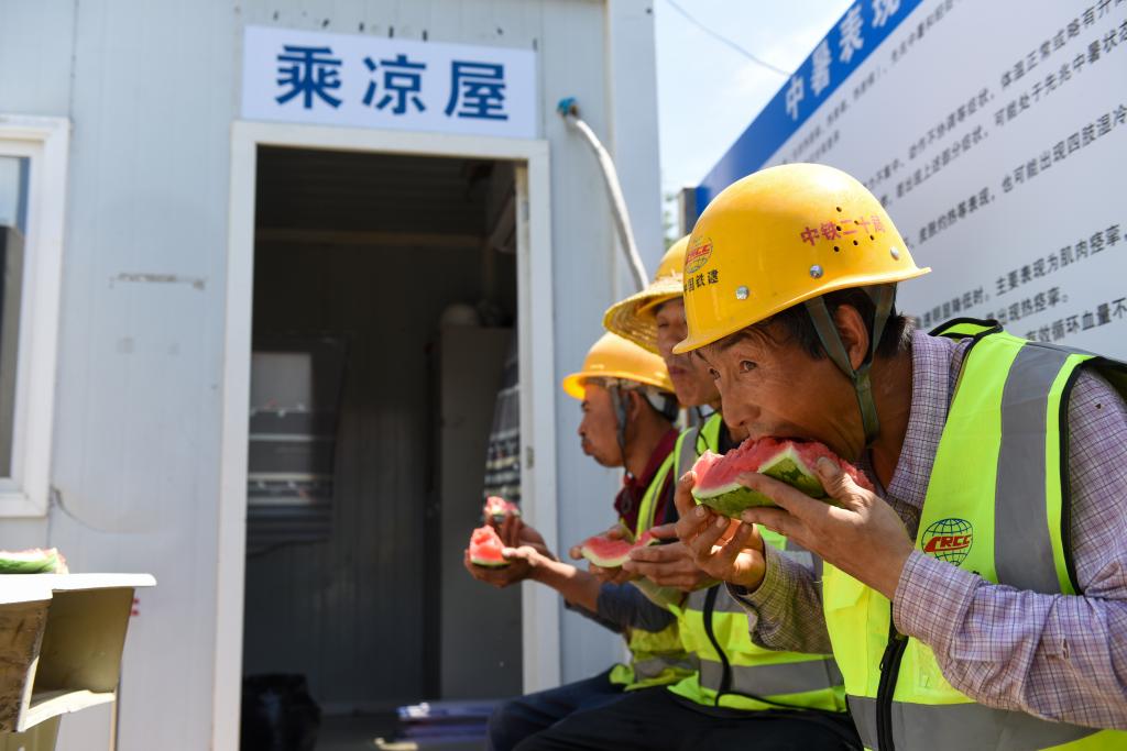 7月27日,工人在“乘凉屋”前吃西瓜。