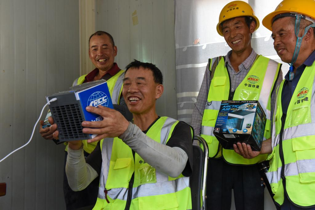 7月27日,工人在“乘凉屋”里使用微型空调扇降温。