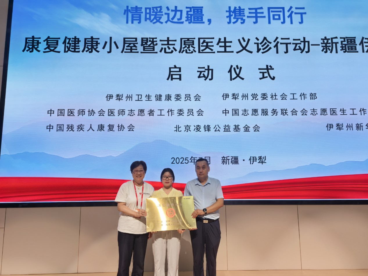 7月21日,康复健康小屋暨志愿医生义诊行动-新疆伊犁站启动仪式在伊犁州新华医院举行。北京凌锋公益基金会理事长凌锋向霍尔果斯市卫健委授予康复健康小屋牌匾,标志着康复健康小屋项目在霍尔果斯正式启动。
