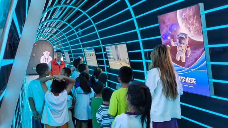 穿过走廊,航天知识科普隧道里光影流转。两侧互动屏幕上,火箭推进原理、航天器变轨技术等知识以动画生动呈现。孩子们伸手触摸屏幕,便能“拆解”长征五号运载火箭的箭体结构。“原来火箭的燃料是液氧和煤油!”学生王浩轩一边操作互动装置,一边与同伴热烈讨论,抽象的航天知识在互动中变得直观易懂。