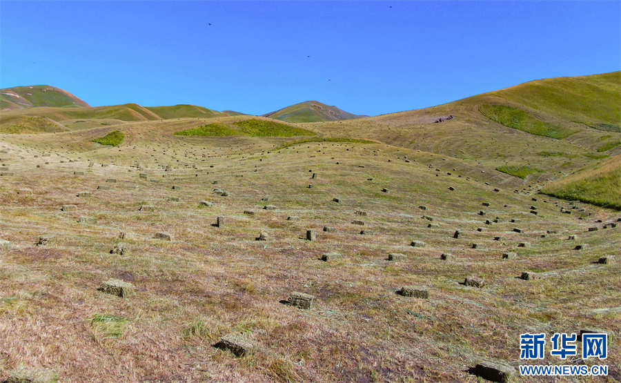 在新源县则克台镇巴音托玛草场,收割完牧草后,方形的草垛散落在草原上,等待拉运。