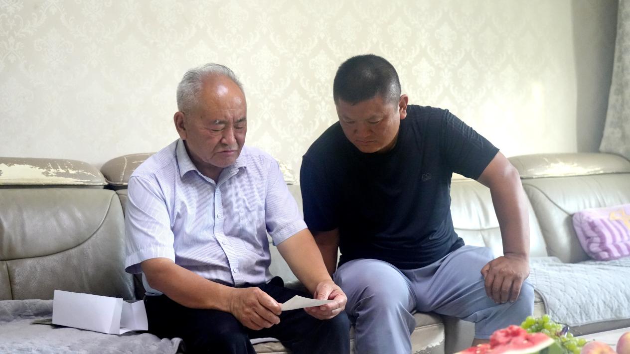 田宝远给儿子田青泉分享年轻时参加柯柯牙荒漠绿化工程的故事(赵新昌 摄)