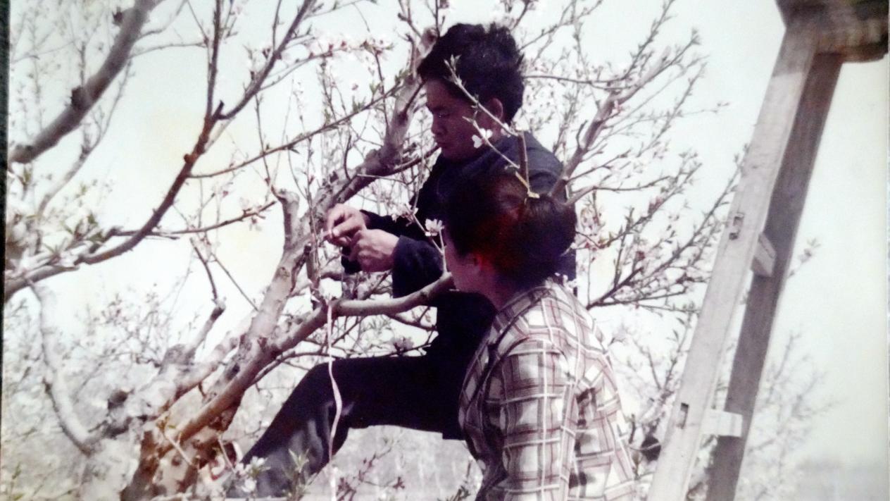 20世纪80年代初,田宝远在温宿县木本粮油林场担任技术员期间,指导农民给果树授粉。(田宝远 提供)