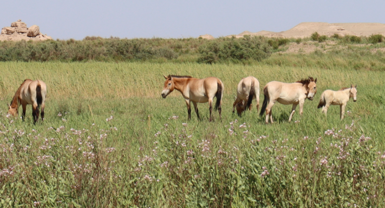普氏野马在敦煌西湖国家级自然保护区马圈湾湿地自由觅食。胡仁巴 摄