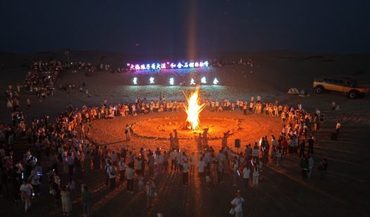 在沙漠之门景区,游客、群众与两地学生围着篝火载歌载舞。施亚军摄