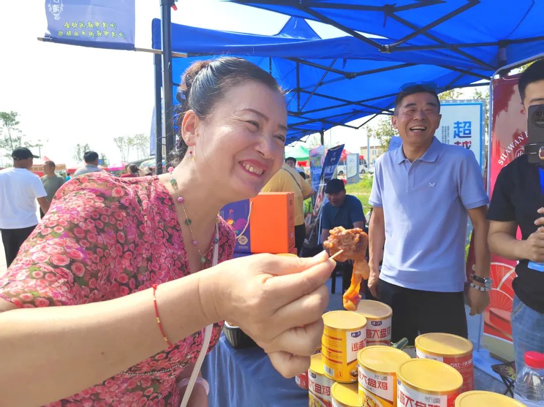 8月1日,美食节多元展销现场,游客在品尝罐装大盘鸡。徐光勇摄