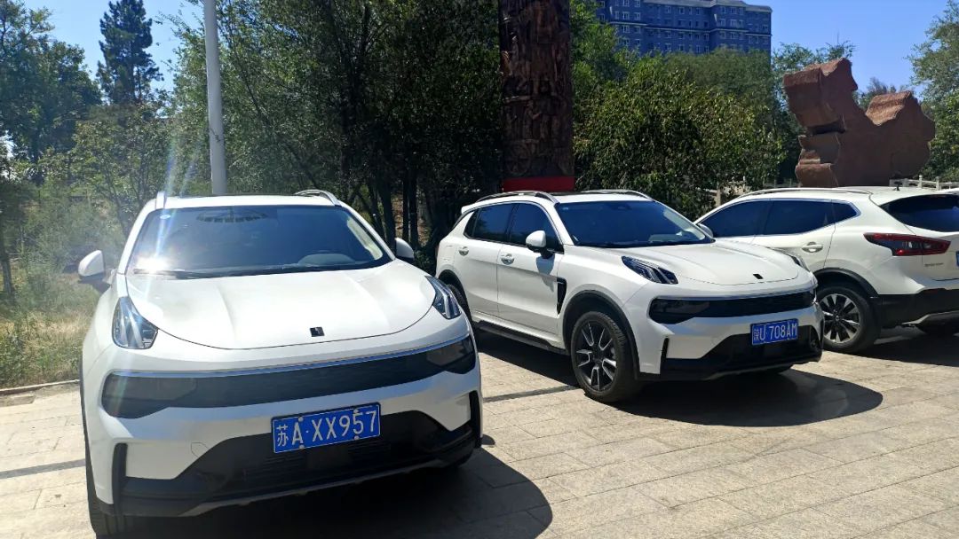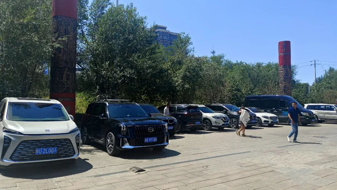 图为:8月1日中午,大盘美食一条街停车场内,停放的各地车辆。汪莹摄影