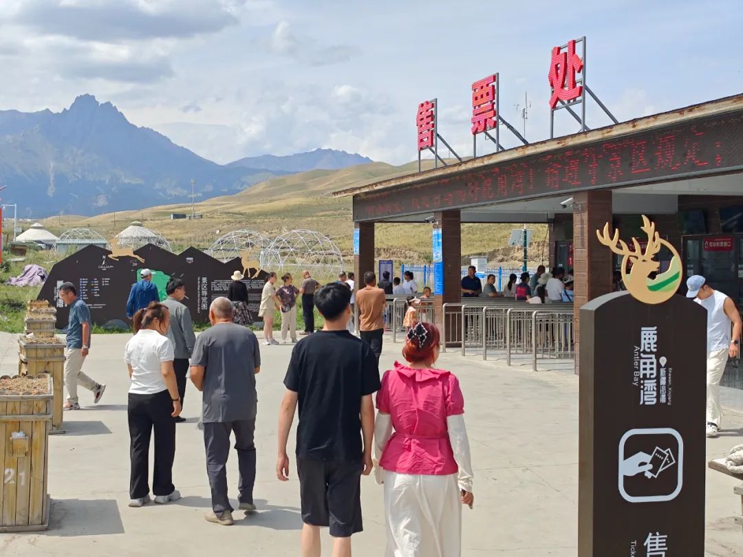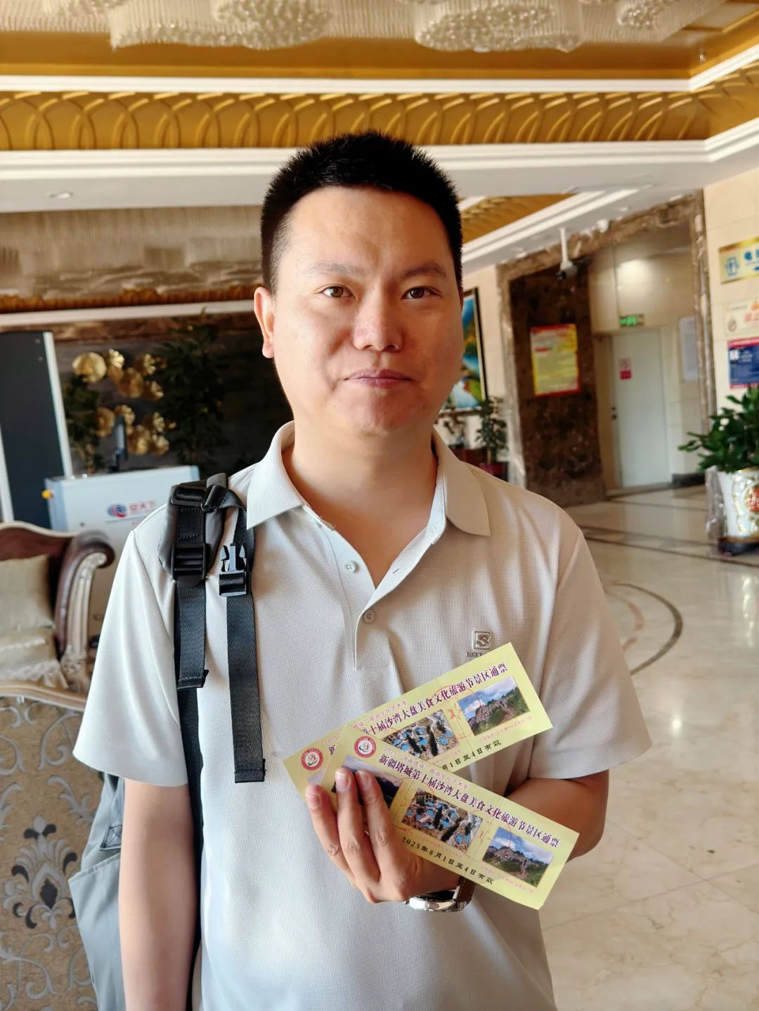 在丝路明珠大酒店,来自重庆的谢先生刚办理完入住,开心地展示着手中的景区联票。 “太幸运了!刚好赶上沙湾住酒店送景区门票活动!吃完大盘鸡,第二天就去鹿角湾转转。”