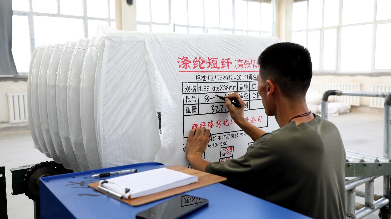 “项目总投资3000万元左右,今年4月份进行设备调试,6月试机投产,是南疆首条再生涤纶短纤生产线。我们根据客户的不同需求,来调整产品参数,生产出符合市场需求的再生涤纶短纤。目前吸纳就业80余人,日产量在45-47吨,项目达产后将实现年产值1.5亿元规模,产品主打高端纺织原料市场,核心供应本地及乌鲁木齐、库尔勒等周边地区的混纺企业,同时正积极打通外贸渠道,进一步扩大销售。”新疆臻鹭化纤有限公司再生涤纶短纤项目负责人承宇介绍说。
