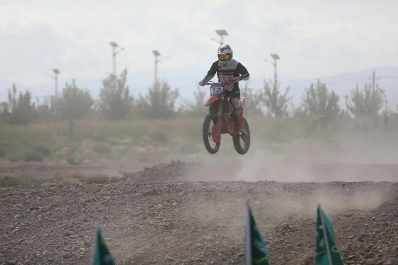 汽摩场地越野赛吸引了来自全国各省市及兵团的120余名选手参赛,随着发令枪声响起,赛车如离弦之箭般冲出起点,时而腾空飞起、时而急速漂移,现场尘土飞扬,赛车的音浪声、轮胎与地面的摩擦声不时响起,惊险刺激的场面赢得观众阵阵掌声。